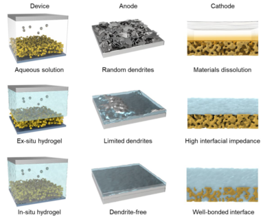 水凝胶具备优良的离子输运调控能力,在水系电池中有本征优势。然而,传统方法制备的水凝胶电解质往往无法确保与电极有良好的接触,在电极表面进行原位聚合可以有效提高电解质与电极界面兼容,降低界面阻抗。基于此,该团队提出了一种原位电聚合方法来构建水凝胶电解质(图2)。在电池循环过程中,界面电化学反应产生自由基,从而自发诱导前驱体溶液聚合成凝胶电解质。电聚合过程中,单体分子直接参与电极表面的氧化还原反应,并在表面发生交联聚合,形成的水凝胶电解质与电极具有深度渗透的物理接触和良好化学结合。以Zn-MnO2电池为例,原位电聚合形成的水凝胶电解质具有双重作用:它促进了阳极界面的锌离子扩散,限制了枝晶生长;在阴极稳固的水凝胶界面有利于电荷转移,提高了电极动力学性能和器件稳定性。