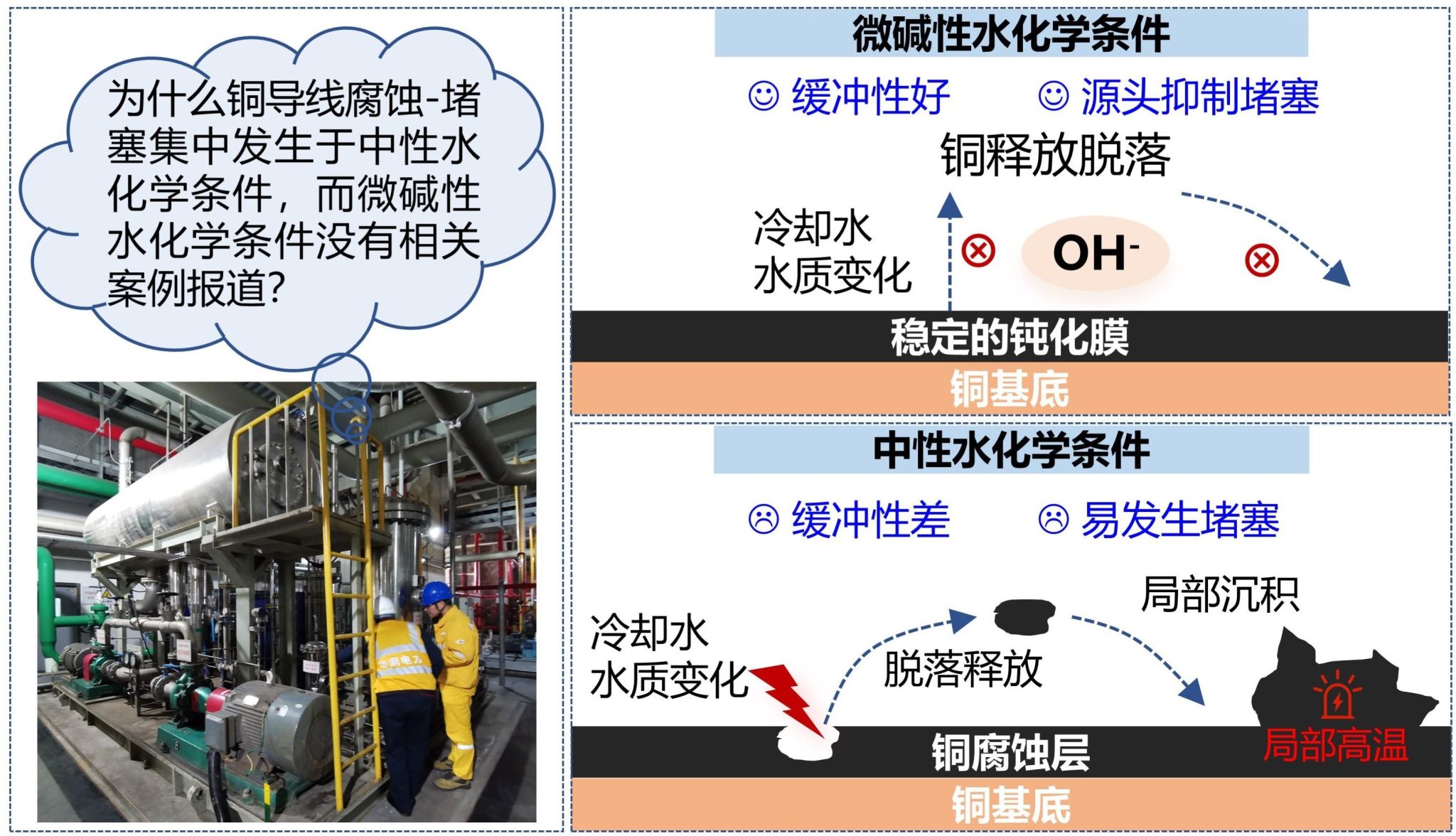 在发电机空芯铜导线冷却系统运行过程中,低电导率的高纯水高速流过定子线圈内狭窄流通截面的空芯铜导线,致使铜导线内表面产生腐蚀,腐蚀产物在狭窄流道内沉积或堵塞,不仅会恶化发电机定子线棒的冷却效果,进而引起定子线圈过热,严重时还会导致发电机跳机、烧毁等重大生产事故。为了抑制铜导线腐蚀-堵塞,现有策略是在不超过冷却水电导率要求的前提下调控冷却水的水质条件,有中性(pH 7.0)和微碱性(pH 8.0-9.0)两种。从理论上来讲,严格的中性和微碱性水化学条件都能抑制铜导线腐蚀-堵塞。然而,现场实际运行却出现了一个令人费解的现象:铜导线腐蚀-堵塞案例集中发生于中性水化学条件,而微碱性水化学条件没有相关报道。这一工程现象背后的科学机理不清晰,成为了长期困扰该领域科技人员的难题。