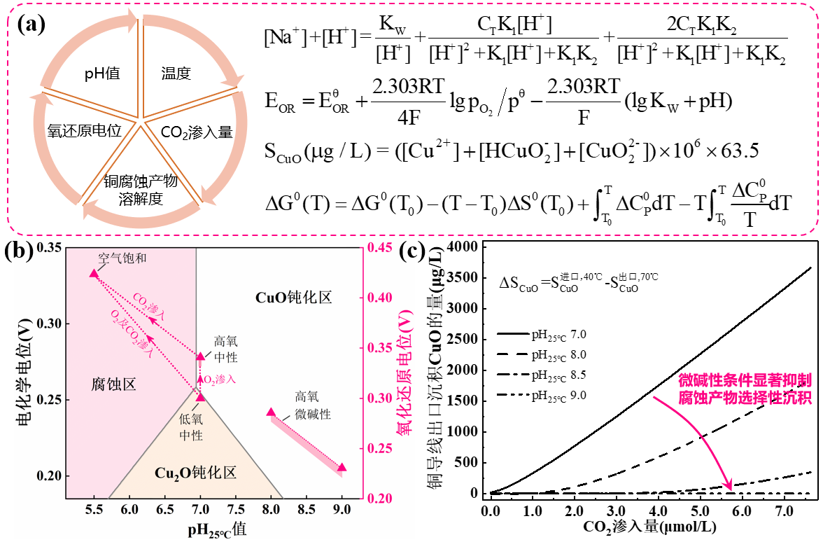 为解决上述问题,该文基于Cu-O2-CO2-H2O多元体系的化学热力学分析,建立了冷却水pH值、氧还原电位、铜腐蚀产物溶解度、温度与CO2渗入量的关联关系(图1a),揭示了铜导线腐蚀-堵塞倾向与水化学条件的关系:(1)铜导线在微碱性水化学条件下处于稳定的CuO钝化区,而在中性水化学条件下处于钝化与腐蚀交界的腐蚀敏感区(图1b)。由于中性水化学条件的缓冲性极差,其水质条件易受到CO2渗入等外界冲击而变化,从而引起铜氧化层的破坏和脱落;(2)在中性水化学条件下,脱落的铜腐蚀产物由于CO2溶蚀与温度流变的耦合效应会在高温区局部沉积,久而久之会堵塞空芯铜导线。微碱性水化学条件的缓冲性好,能显著抑制了这一耦合效应的负面影响,且抑制效果随碱化程度的提高而增强(图1c)。调控冷却水处于合适的微碱性范围,可以从根源上预防铜导线腐蚀-堵塞。