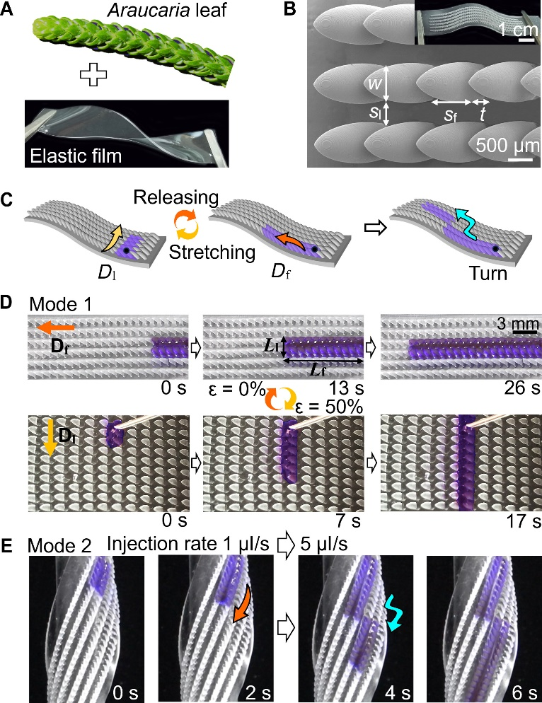 针对这一挑战,薛龙建教授团队创新性地提出了一种可在亲液表面实现液体流动方向原位可逆调控的新策略。该团队受南洋杉叶片三维棘轮结构启发,结合3D打印与软印刷技术,成功制备了具有三维棘轮阵列结构的弹性液体二极管(TELD)。TELD巧妙地将南洋杉叶片液体定向传输特性与硅橡胶弹性特性相结合,展现出以下显著优势:(1)实现了亲液表面液体流动在正交方向上的可控调节;(2)建立了两种模式可即时调控液体流动方向;(3)无需在TELD或液体中添加任何响应性物质即可实现上述功能。在模式1中,液体在TELD表面沿棘轮倾斜方向呈现单向流动特性;当TELD拉伸至临界伸长率(ε = 27%)以上时,流动方向发生90°转向,且通过拉伸-释放循环可对液体流动方向进行可逆调控。在模式2中,通过调控液体注射速率,在螺旋形TELD上实现了流动路径的“瞬时变轨”。此外,TELD在逻辑门控、液体应力阀、微流控反应器及雾水收集器等领域展现出广泛的应用潜力。
