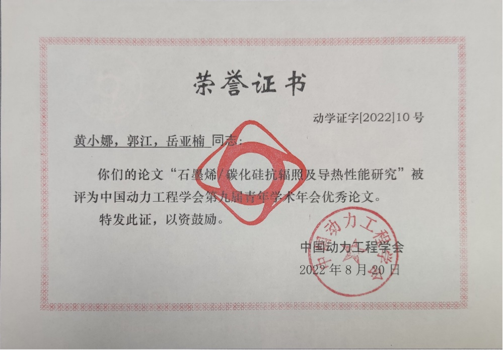 8月20日,中国动力工程学会第九届青年学术年会在长沙理工大学顺利召开。在年会上,我院教师黄小娜、郭江、岳亚楠合作的论文《石墨烯/碳化硅抗辐照及导热性能研究》被评为年会优秀论文,并颁发荣誉证书。