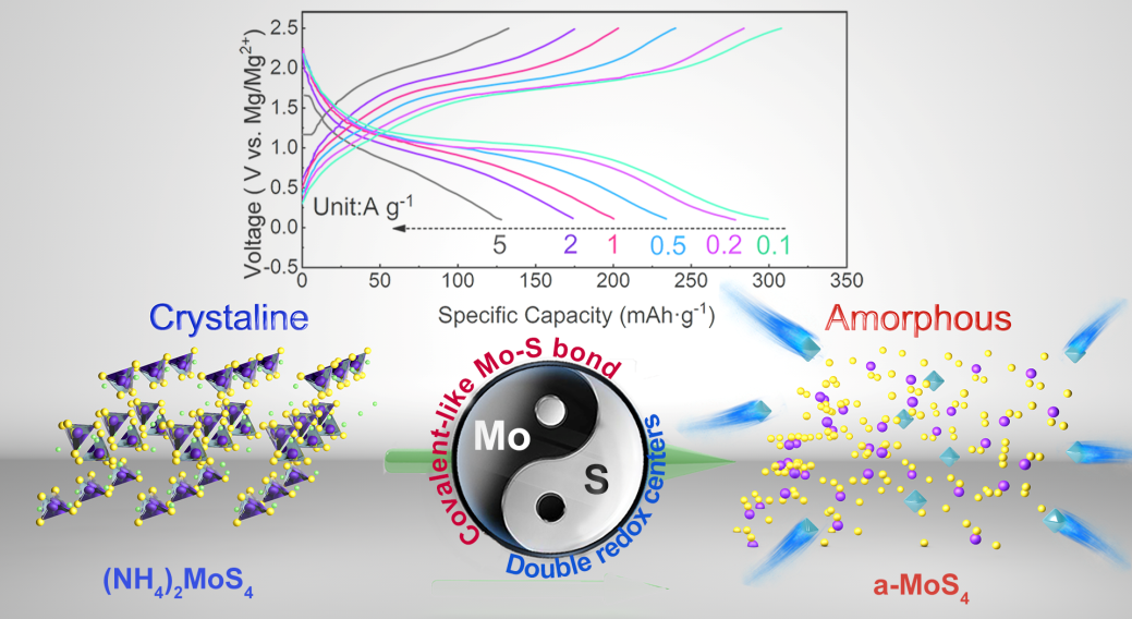目前镁电池发展的最主要难点在于正极材料的开发,镁离子(0.72Å)与锂离子(0.76Å)半径相当,但带有两个单位正电荷,与正极材料作用力强,常见的正极材料储镁活性位点有限且动力学性能较差。针对此问题,徐飞副教授课题组提出以类共价键键合钼硫族化合物作为镁电池正极的策略。钼和硫原子之间的类共价键键合,实现了充放电过程中双元素的氧化还原,从而提供了较高的储镁容量。同时,钼和硫原子之间的类共价键键合促进了电荷离域,削弱了材料与镁离子之间的相互作用力,从而提升了动力学性能。并且,电化学原位形成的空穴为镁离子的传输与存储提供了有效空间。该工作日前发表在美国化学会期刊ACS Nano上。
