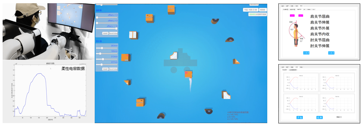 本研究还开发了多种机器人控制模式:主动助力模式、辅助助力模式以及阻抗模式,分别适用于患者上肢康复训练阶段中的急性期、恢复期以及保持期。开发了人机交互虚拟现实康复训练软件,设计的VR游戏可提高患者训练的积极性,并可以进行康复训练效果评估。目前团队与武汉大学中南医院、人民医院合作,正在开展康复机器人的临床应用研究,并与湖北省残疾人辅助器具资源中心合作,开展机器人的居家康复应用推广。