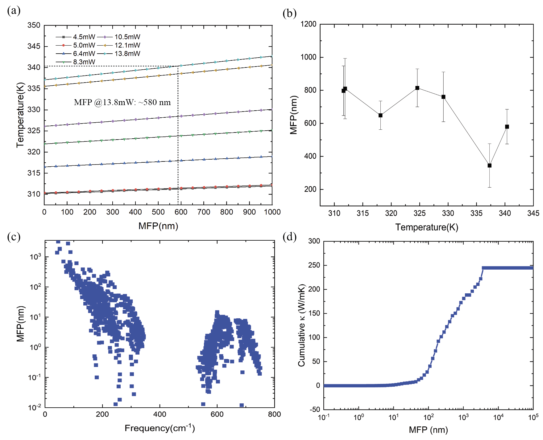 由于光学衍射效应,基于激光的热测量方法较难应用于纳米尺度传热测量,而电学方法中,扫描热显微镜技术受制于纳米接触热阻的问题也有较大的热测量误差。因此,纳米热点的可控生成及温度测量一直是工程热物理领域研究的热点和难点。团队针对该难题发展的针尖增强拉曼测热技术,同时解决了纳米热点的生成及测温难题,实现了10nm尺度热点的传热研究。研究发现由于声子输运的影响,纳米尺度下热点的局部热导率远低于宏观热导率值。进一步结合光热耦合模拟和分子动力学研究,分析了声子在纳米尺度热点处的弹道输运行为,并测算出声子平均自由程,研究发现氮化镓声子平均自由程随温度降低的现象。