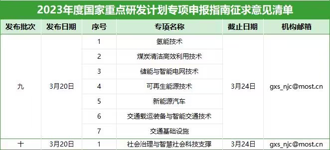 国家科技部近日发布了《关于对“十四五”国家重点研发计划能源与交通领域重点专项2023年度项目申报指南征求意见的通知》、《关于国家重点研发计划“社会治理与智慧社会科技支撑”重点专项2023年度“揭榜挂帅”榜单征求意见的通知》。本次意见征集包括“氢能技术”、“煤炭清洁高效利用技术”、“储能与智能电网技术”、“可再生能源技术”、“新能源汽车”、“交通载运装备与智能交通技术”、“交通基础设施”、“社会治理与智慧社会科技支撑(揭榜挂帅)”八个专项,且同时设置青年科学家项目。