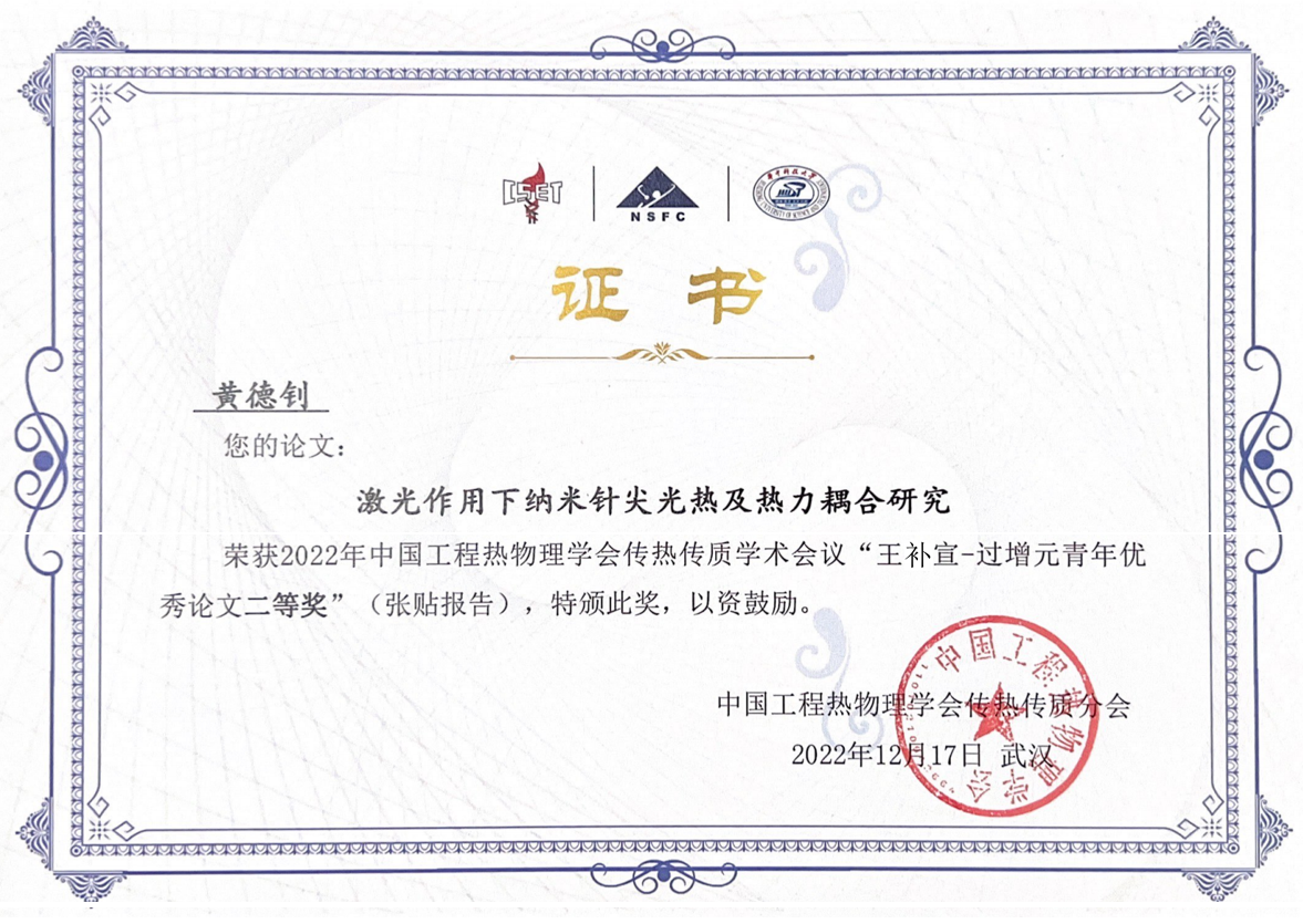 2022年12月16-18日,中国工程热物理学会传热传质学术会议暨国家自然科学基金项目进展交流会顺利召开。在年会上,我院黄德钊、黄小娜和岳亚楠教授合作的论文《激光作用下纳米针尖光热及热力耦合研究》荣获2022年中国工程热物理学会传热传质学术会议 “王补宣-过增元青年优秀论文二等奖”,并颁发荣誉证书。