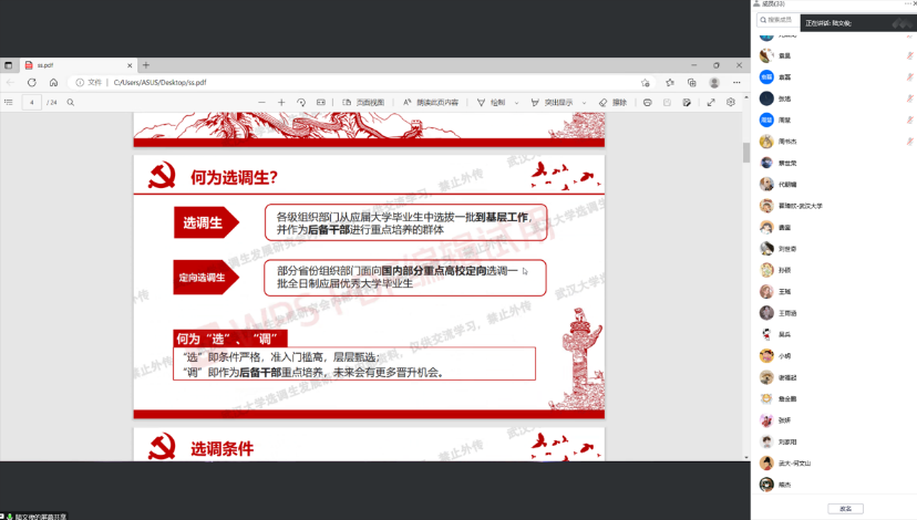 为帮助后疫情时代下研究生们高质量就业,早做准备,有的放矢,武汉大学样板党支部、动力与机械学院机械系研究生第一党支部在本期“研学蓄能·我为群众办实事”系列活动中,于2022年12月8日开展了“薪火相传,互助分享”就业经验分享会,邀请了党支部已获得工作邀约或有笔试面试经验的师兄师姐们来分享他们的就业经验,供即将步入毕业年级的同学们参考学习。