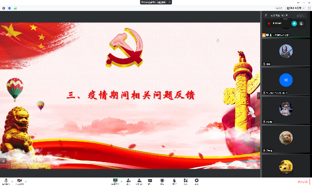 之后,刘泽庭就学校疫情防控期间大家关心的问题进行了解答,就疫情期间的党建工作开展要求进行了强调。他提到,学生党员骨干要当好“领头雁”“排头兵”,在学院内凝心聚力、统一意识,引导大家理性思考、勇于担当,筑牢疫情防控坚固防线。
