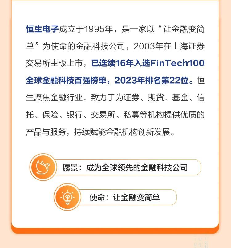 【公司简介】恒生电子成立于1995年,是一家以“让金融变简单”为使命的金融科技公司,2003年在上海证券交易所主板上市。已连续16年入选FinTech100全球金融科技百强榜单,2023年排名第22位,位列中国上榜企业第一。恒生聚焦金融行业,致力于为证券、期货、基金、信托、保险、银行、交易所、私募等机构提供优质的产品与服务,持续赋能金融机构创新发展。