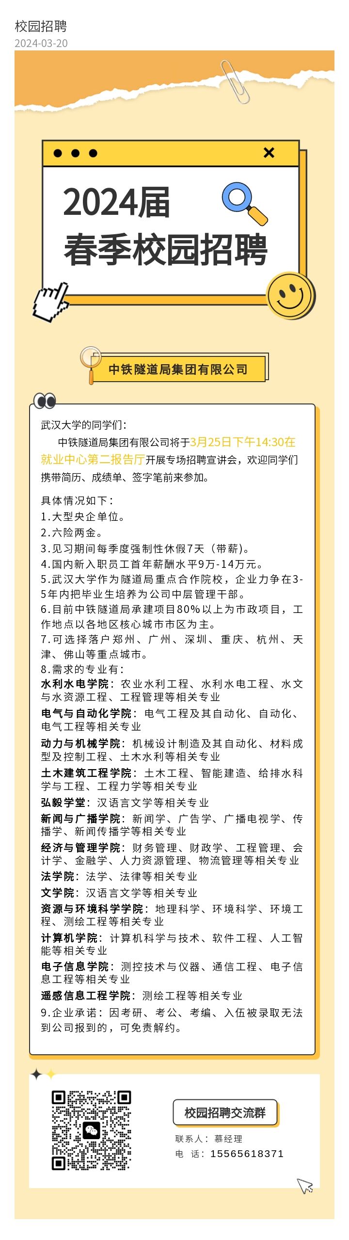 中铁隧道局集团有限公司将于3月25日下午14:30在就业中心第二报告厅开展专场招聘宣讲会,欢迎同学们携带简历、成绩单、签字笔前来参加。