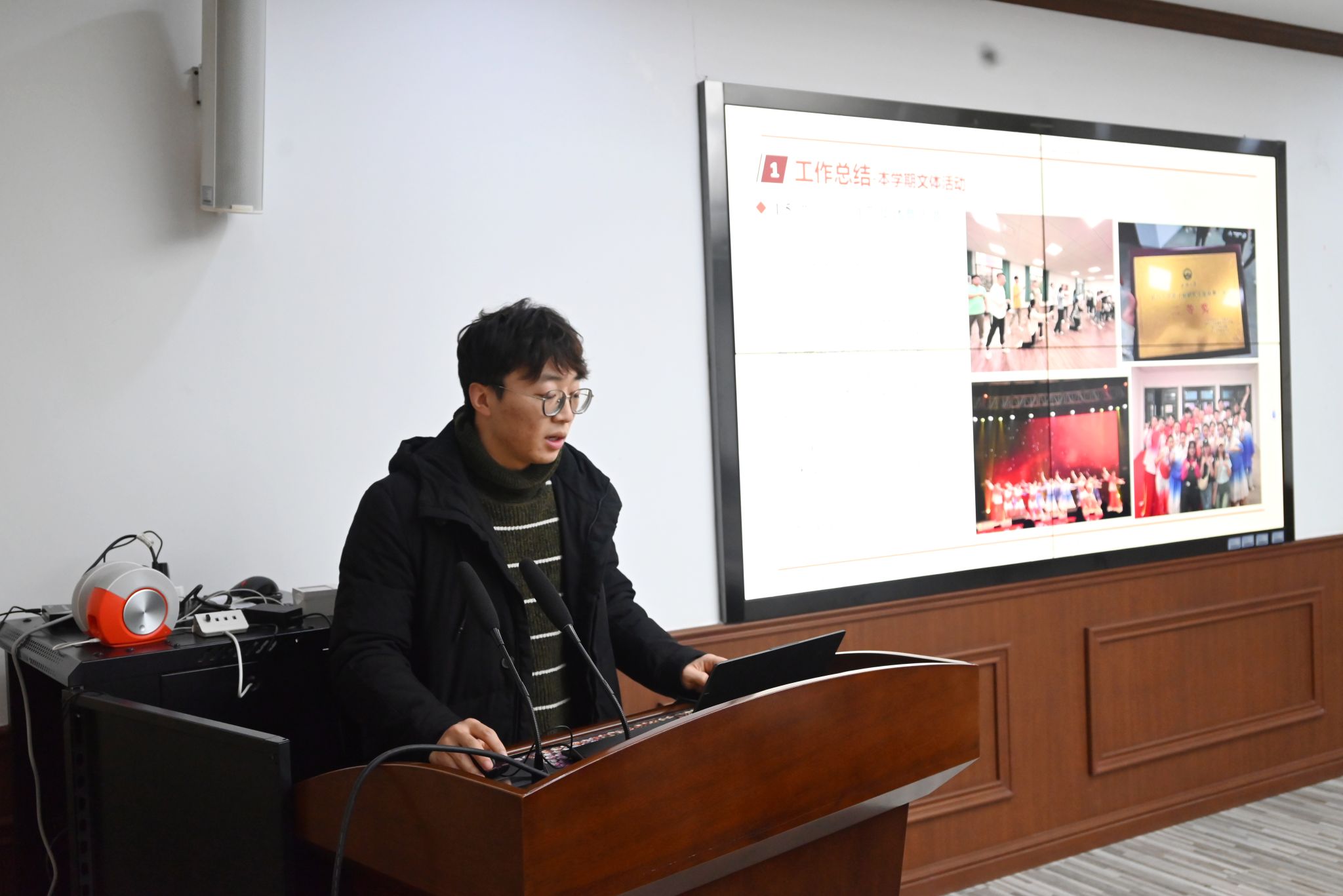 院研究生会文体部负责人徐子健同学详细介绍了过去八个月内文体部主要负责的“武大制躁”摇滚音乐节、毕业季球赛活动、“百卅•珞珈芳华”研究生集体舞大赛、“师生趣味运动会”、校篮球研赛和元旦晚会等活动。上述活动在提升了同学、班级、师生之间的凝聚力和互动水平的同时,还为大家提供了展现文艺体育风采的平台,增强了大家的身体素质,提高了同学们的自信心。最后,徐子健同学也结合以上日常工作的思考,对文体部过去的工作内容做出了反思,并对研会的发展提出了相关建议。