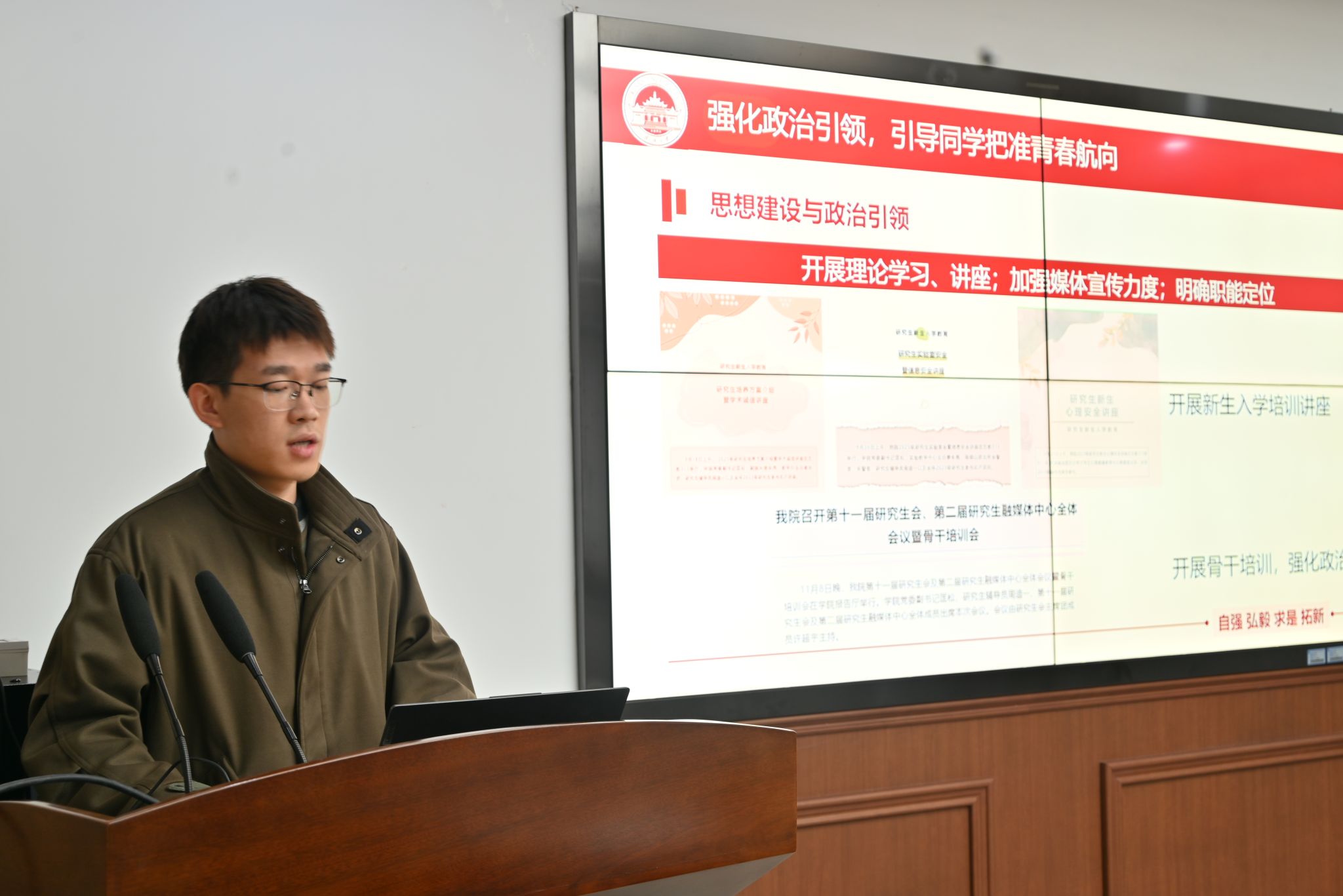 校研究生代表大会常任代表委员高宇洋同学就履职以来在校研究生会开展的主要工作进行介绍,包括月度提案的提交、校研究生会骨干培训及和“我心目中的好导师”等活动的开展情况。最后,高宇洋同学对我院研究生会工作的开展表达了充分的支持,希望我院研会能在接下来的工作中继续前行、再创佳绩。
