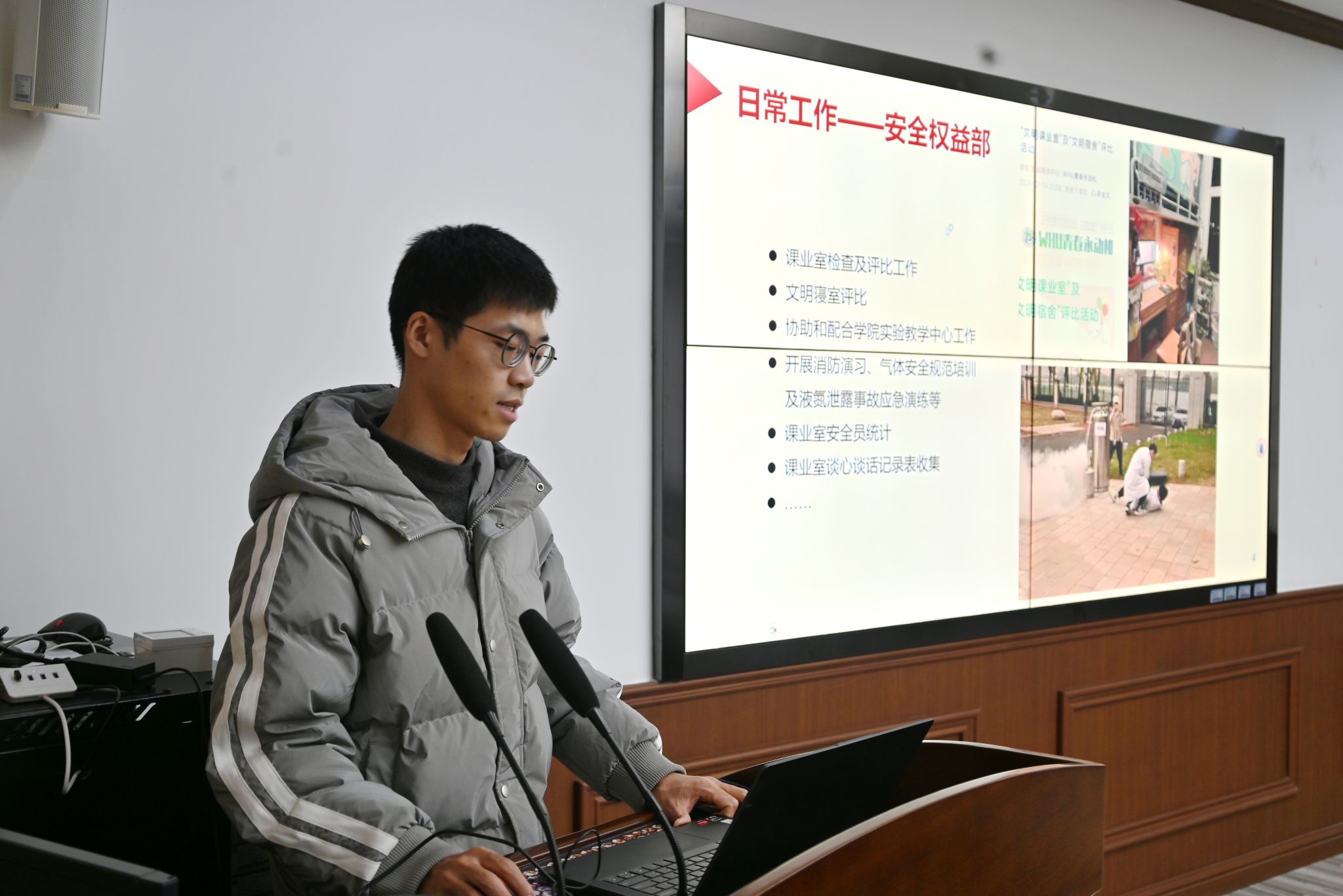 院研究生会安全权益部负责人常一龙同学从介绍了安全权益部近期的主要工作。主要包括“研究生新生实验室安全宣讲”“课业室、实验室安全卫生检查”“消防安全演练”“液氮泄漏事故应急演练”“文明课业室、寝室评比”。回顾2023的活动开展方面的问题,展望2024未来要开展的活动。