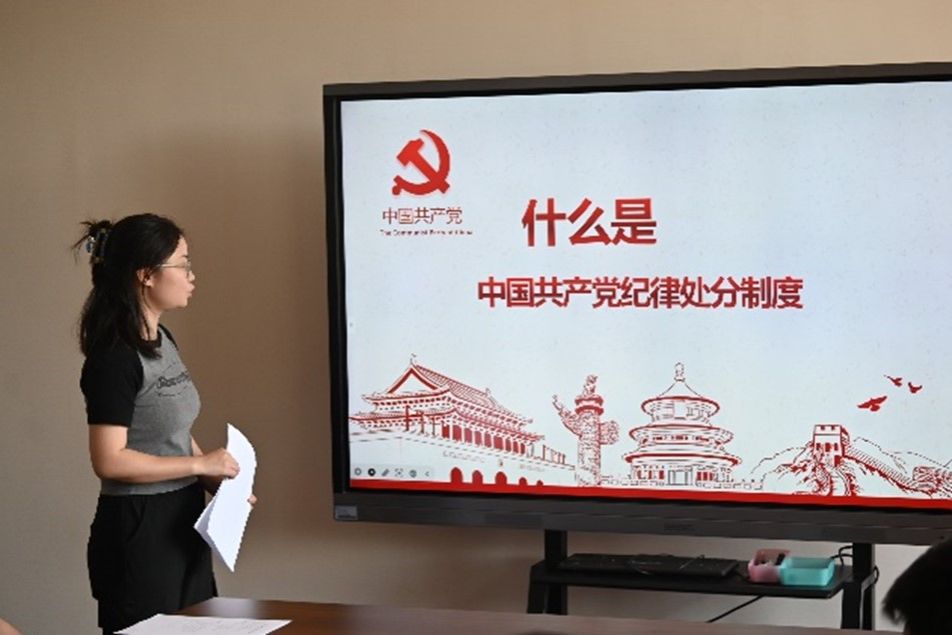 会议伊始,动力与机械学院研究生机械系第一党支部费銮领学《中国共产党纪律处分条例》,她从案例着手,详细介绍了政治纪律、组织纪律、廉洁纪律、群众纪律、工作纪律、生活纪律。她提到,每位党员都应该把遵规守纪刻印在心,内化为言行准则,进一步强化纪律意识、加强自我约束。