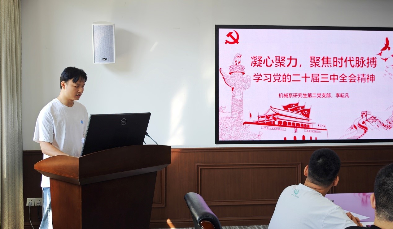 会议第三项进行理论学习培训——凝心聚力,聚焦时代脉搏。机械系研究生第二党支部书记李耘凡领学党的二十届三中全会精神。系统学习了《中共中央关于进一步全面深化改革、推进中国式现代化的决定》的相关内容,围绕进一步全面深化改革的重要性和必要性、指导思想以及总体目标展开学习,深刻解读了党的二十届三中全会的构建高水平社会主义市场经济体制意义重大等相关决定。