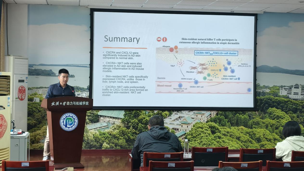 孙正旺以“skin-resident natural killer T cell participate in cutaneous allergic inflammtion in atopic dermatitis”为主题展开学术分享。作为纳米医药领域的优秀学者,他结合自己的研究工作,详细阐释了新型无PEG纳米颗粒的研发原理,展示了纳米抗体偶联药物在皮肤免疫治疗中的突破性应用,并通过临床前数据论证了该技术在提升靶向性和安全性方面的显著优势。报告特别针对传统纳米药物递送系统的技术瓶颈,分享了纳米抗体偶联药物递送和精准免疫治疗领域多项创新性成果
